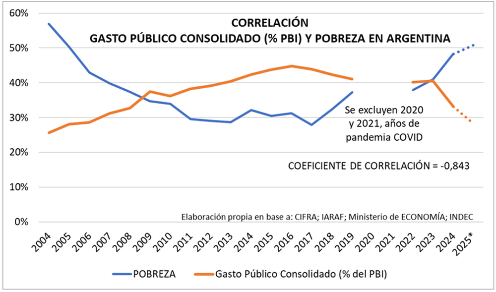 El análisis muestra una correlación inversa de -0,843 (muy elevada) entre gasto público consolidado (nación, provincias y municipios) y pobreza. Es decir, cuando el Estado se ajusta, la pobreza aumenta. Esta relación, observada consistentemente desde 2004, convierte en inexplicable la caída de pobreza reportada oficialmente en un contexto de: